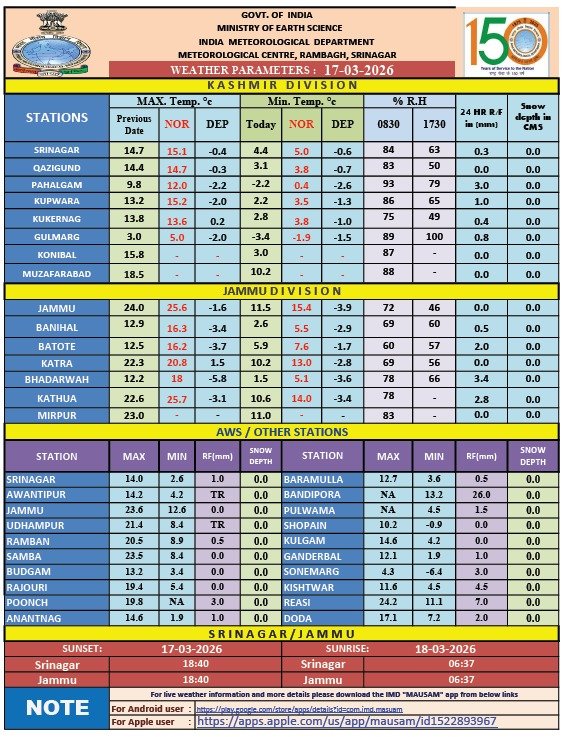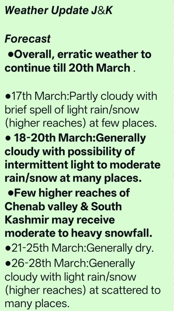 𝙒𝙚𝙖𝙩𝙝𝙚𝙧 𝙐𝙥𝙙𝙖𝙩𝙚 𝙅&𝙆●18-20 March:Intermittent light to moderate rain/snow (higher reaches) at most places.●Few higher reaches of Chenab valley & South KMR may receive moderate/heavy snowfall.●21-25March:Generally dry●26-28March:Light rain/snow at many places.