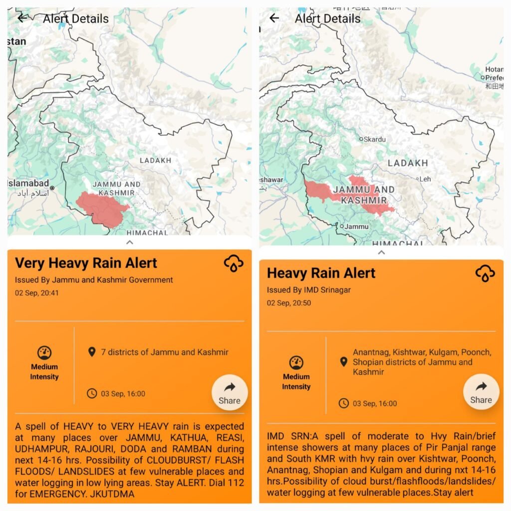 A spell of HVY to VERY HVY Rain is expected at many places over JMU,KATHUA,REASI,UDH, DODA,RAJOURI & RAMBAN during nxt 14-16hrs.●A spell of moderate to Hvy Rain/brief intense showers at many places of PirPanjal range including Kishtwar & South KMR during nxt 14-16hrs.