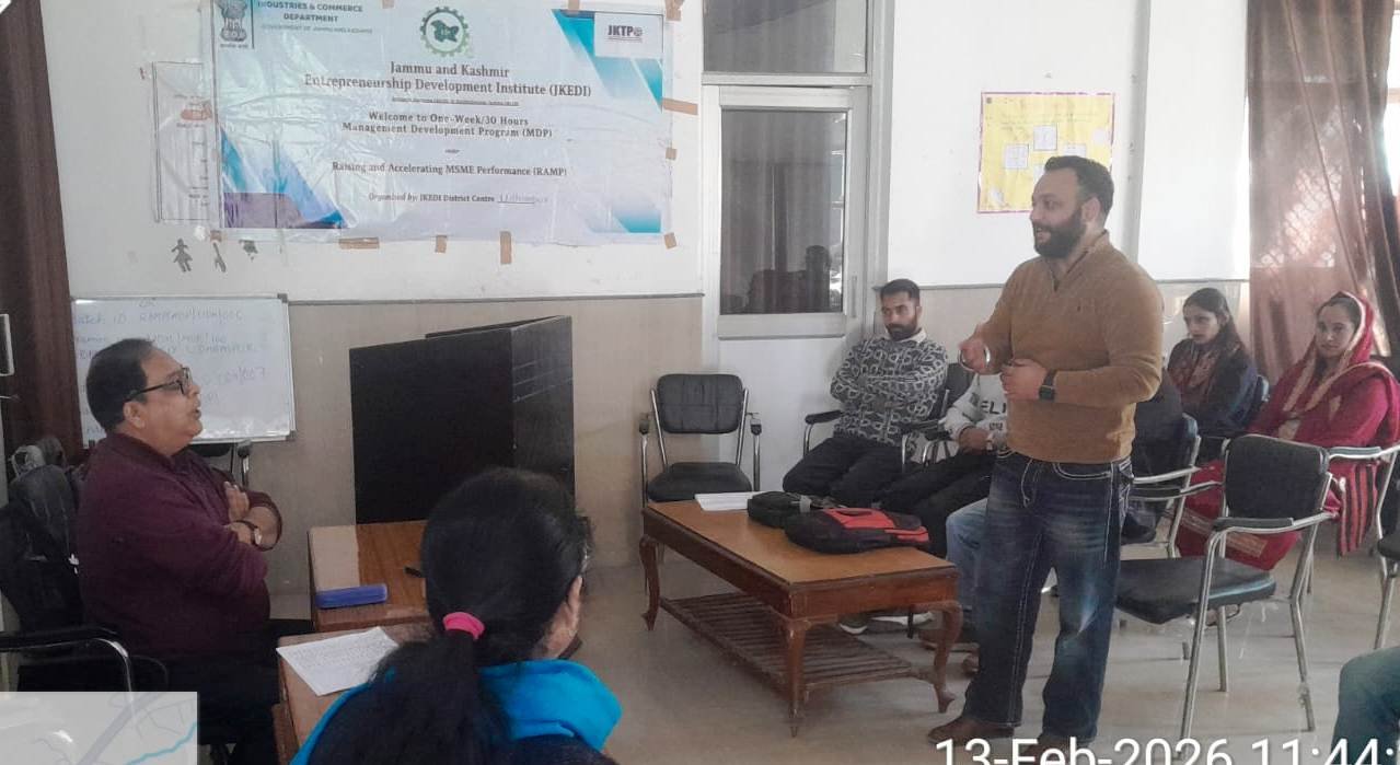 UDHAMPUR, FEBRUARY 13: Additional District Development Commissioner (ADDC) Udhampur, Jugal Kishore Anand, today visited the Jammu and Kashmir Entrepreneurship Development Institute (JKEDI) District Centre in Udhampur. He interacted with trainees of the Hybrid Mode Capacity Building Programme, currently being conducted under Mission YUVA.