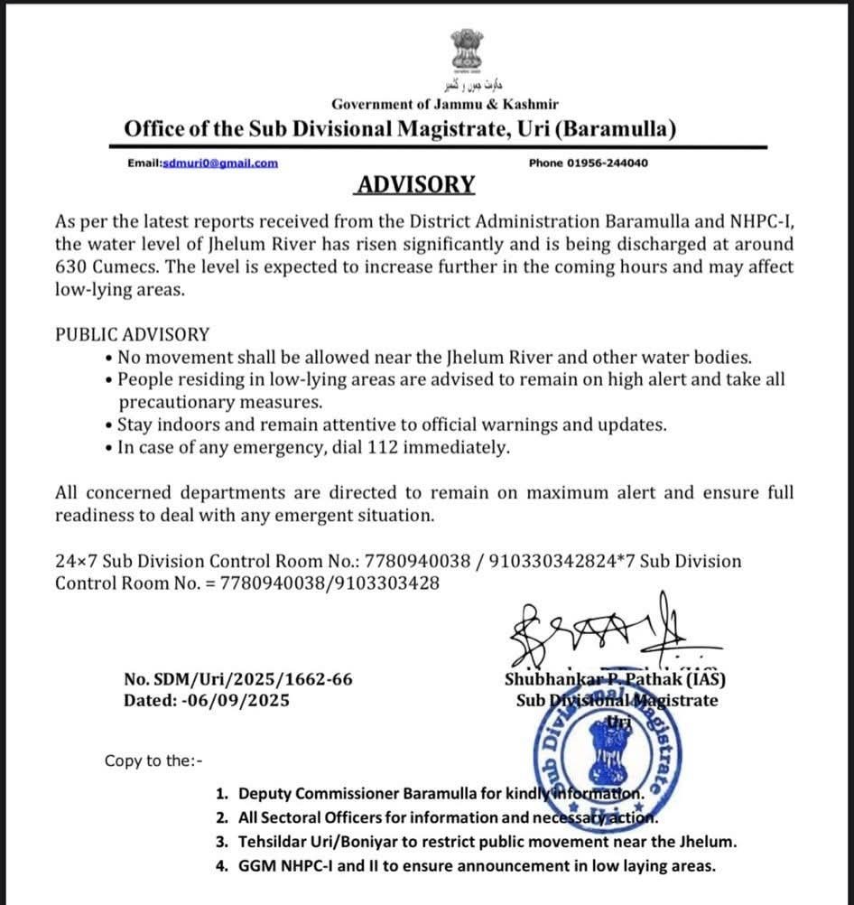 HomeJammu Kashmir Jammu Kashmir As per the latest alert received the water level of River Jhelum increased General public of Sub Division Uri are requested to avoid all movement near river Jhelum at any cost. By JK Sampark Newsroom September 6, 2025 18 FacebookTwitterWhatsAppPrintTelegram Share FacebookTwitterWhatsAppPrintTelegram Previous articleJammu: Eid Milad-un-Nabi processionNext articleShilp Samagam Mela: Celebration of Art, Craft and Culture JK Sampark Newsroomhttps://jksampark.in/ Related Articles Breaking News Jai Mata Di …!!! Jammu Kashmir 77th Republic Day celebrated at District Court Complex Kathua Breaking News With profound grief and sorrow, we inform you of the sad and sudden demise of our beloved Mr. Ravi Mahajan (S/o Late Sh. Dev... LEAVE A REPLY Cancel reply Comment: Please enter your comment! Name:* Please enter your name here Email:* You have entered an incorrect email address! Please enter your email address here Website: Save my name, email, and website in this browser for the next time I comment. - Advertisement - Latest Articles Breaking News Jai Mata Di …!!! Jammu Kashmir 77th Republic Day celebrated at District Court Complex Kathua Breaking News With profound grief and sorrow, we inform you of the sad and sudden demise of our beloved Mr. Ravi Mahajan (S/o Late Sh. Dev... Jammu Kashmir Pakistani Intruder Shot Dead by BSF Along International Border in Samba Jammu Kashmir High Court celebrates 77th Republic Day with unprecedented enthusiasm, dignity at Jammu Load more