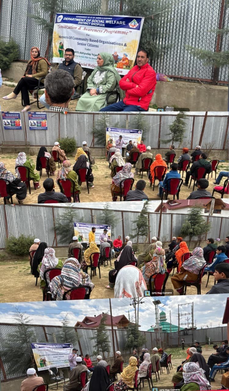 SHOPIAN, MARCH 12: Social Welfare Department Shopian organised a sensitisation and awareness programme on Wednesday for senior citizens under the Atal Vayo Abhyuday Yojana at Palaash, Pinjora.