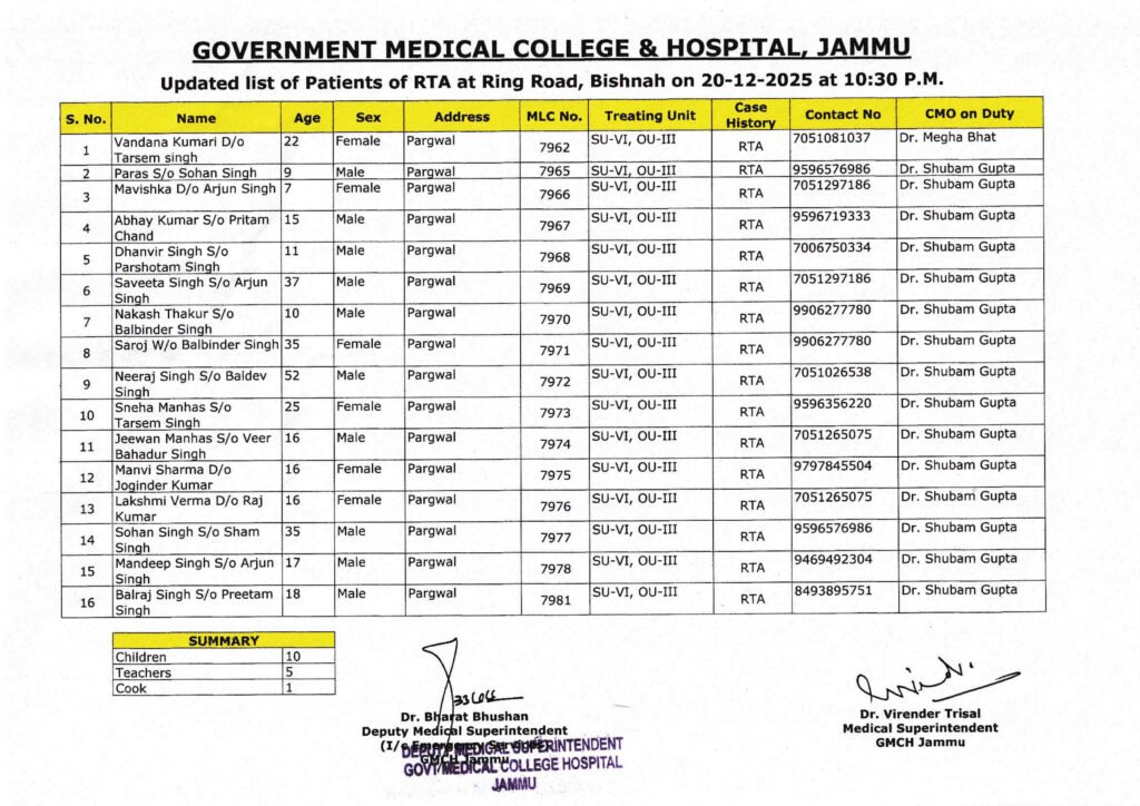 HomeBreaking News Breaking NewsEducationHealthcare BREAKING | A school bus carrying children on a picnic met with a tragic accident in Jammu after it overturned. Several students sustained injuries in the incident. By JK Sampark Newsroom December 20, 2025 17 FacebookTwitterWhatsAppPrintTelegram Share FacebookTwitterWhatsAppPrintTelegram Previous articleLieutenant Governor chairs high level review meeting of Subordinate Departments of Home DepartmentNext articleLieutenant Governor congratulates Indian Railways after first-ever foodgrain freight train reached Kashmir valley carrying approximately 1384 tonnes of rice JK Sampark Newsroomhttps://jksampark.in/ Related Articles Breaking News The mighty Chenab Bridge, the world’s highest Railway arch bridge, stands resplendent, bathed in radiant Tricolour lights, echoing the spirit of the Nation on... Breaking News Congratulations to Group Captain Shubhanshu Shukla on being awarded the #AshokaChakra, the nation’s highest peacetime #gallantryaward. This prestigious honour stands as a testament to... Breaking News Award for Outstanding Media Persons LEAVE A REPLY Cancel reply Comment: Please enter your comment! Name:* Please enter your name here Email:* You have entered an incorrect email address! Please enter your email address here Website: Save my name, email, and website in this browser for the next time I comment. - Advertisement - Latest Articles Breaking News The mighty Chenab Bridge, the world’s highest Railway arch bridge, stands resplendent, bathed in radiant Tricolour lights, echoing the spirit of the Nation on... Breaking News Congratulations to Group Captain Shubhanshu Shukla on being awarded the #AshokaChakra, the nation’s highest peacetime #gallantryaward. This prestigious honour stands as a testament to... Breaking News Award for Outstanding Media Persons Jammu Kashmir Full Dress Rehearsal for R-Day-2026 held at Gool Jammu Kashmir SDM Gool conducts surprise visit to Gool market, CHC Load more