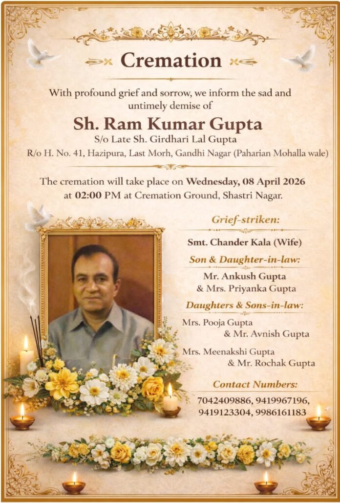 The cremation will take place on Wednesday, 08-04-2026 at Cremation Ground, Shastri Nagar at 02:00 PM.