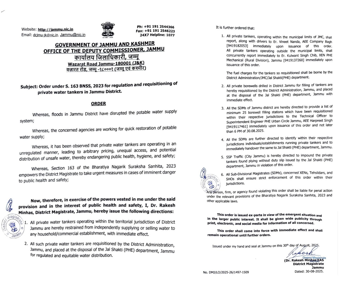 JAMMU, AUGUST 30: In view of disruption of potable water supply due to incessant rains and flood, District Magistrate Jammu Dr Rakesh Minhas today invoked Section 163 of the Bhartiya Nagarik Suraksha Sanhita- 2023, to regulate the operation of private water tankers. The step has been taken to safeguard public health and ensure equitable distribution of drinking water.