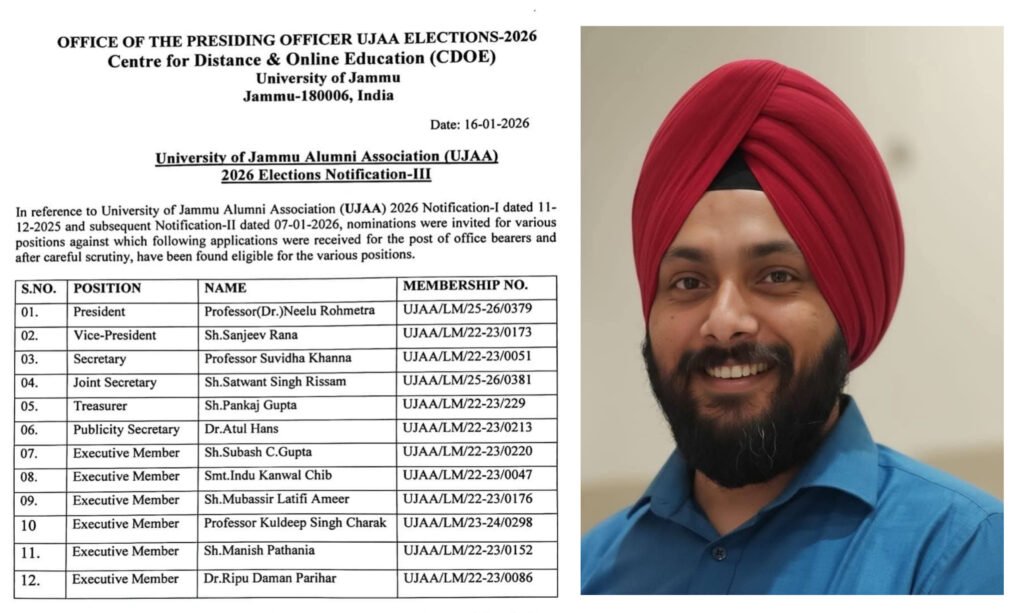 Jammu: The University of Jammu has declared the results of the University of Jammu Alumni Association (UJAA) elections, in which Dr. Satwant Singh Rissam—a distinguished media and communications professional, author, and heritage enthusiast—was unanimously elected as Joint Secretary for a two-year term. An alumnus of the university’s Department of Law, Dr. Rissam earned this role through the strong trust and support of his peers.UJAA plays a vital role in the university’s ecosystem, organizing alumni meets, placement and career counseling sessions, and lecture series to enrich the intellectual and academic environment.In this position, Dr. Rissam will work closely with the university administration to strengthen ties between graduates and their alma mater, driving initiatives that bolster the institution’s legacy. Expressing gratitude to association members for their confidence, he shared: “The University depends on us, its alumni. When it calls, we must step forward.”