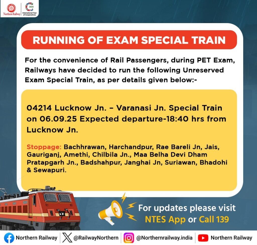 HomeBreaking News Breaking NewsEducationGovernment For the convenience of Rail Passengers, during PET Exam, Railways have decided to run the following Unreserved Exam Special Train, as per details given below:- By JK Sampark Newsroom September 6, 2025 16 FacebookTwitterWhatsAppPrintTelegram ExamSpecialTrain TagsBreaking newsBulletinExam trainJammuJammu Kashmir leading news channelJK samparkLatest newsMain headlinesSpecial trainsTodays news Share FacebookTwitterWhatsAppPrintTelegram Previous articleGovt Emblems Meant for Offices, Not Shrines: Omar Abdullah on Hazratbal Plaque RowNext articleToday on 6th September 2025 Medical Camps Organized in Flood & Landslide Affected Areas in block chenani to provide immediate health care to the affected population. @JJM_JK JK Sampark Newsroomhttps://jksampark.in/ Related Articles Jammu Kashmir 77th Republic Day celebrated at District Court Complex Kathua Breaking News With profound grief and sorrow, we inform you of the sad and sudden demise of our beloved Mr. Ravi Mahajan (S/o Late Sh. Dev... Jammu Kashmir Pakistani Intruder Shot Dead by BSF Along International Border in Samba LEAVE A REPLY Cancel reply Comment: Please enter your comment! Name:* Please enter your name here Email:* You have entered an incorrect email address! Please enter your email address here Website: Save my name, email, and website in this browser for the next time I comment. - Advertisement - Latest Articles Jammu Kashmir 77th Republic Day celebrated at District Court Complex Kathua Breaking News With profound grief and sorrow, we inform you of the sad and sudden demise of our beloved Mr. Ravi Mahajan (S/o Late Sh. Dev... Jammu Kashmir Pakistani Intruder Shot Dead by BSF Along International Border in Samba Jammu Kashmir High Court celebrates 77th Republic Day with unprecedented enthusiasm, dignity at Jammu National Prime Minister extends greetings to all citizens on Republic Day Load more