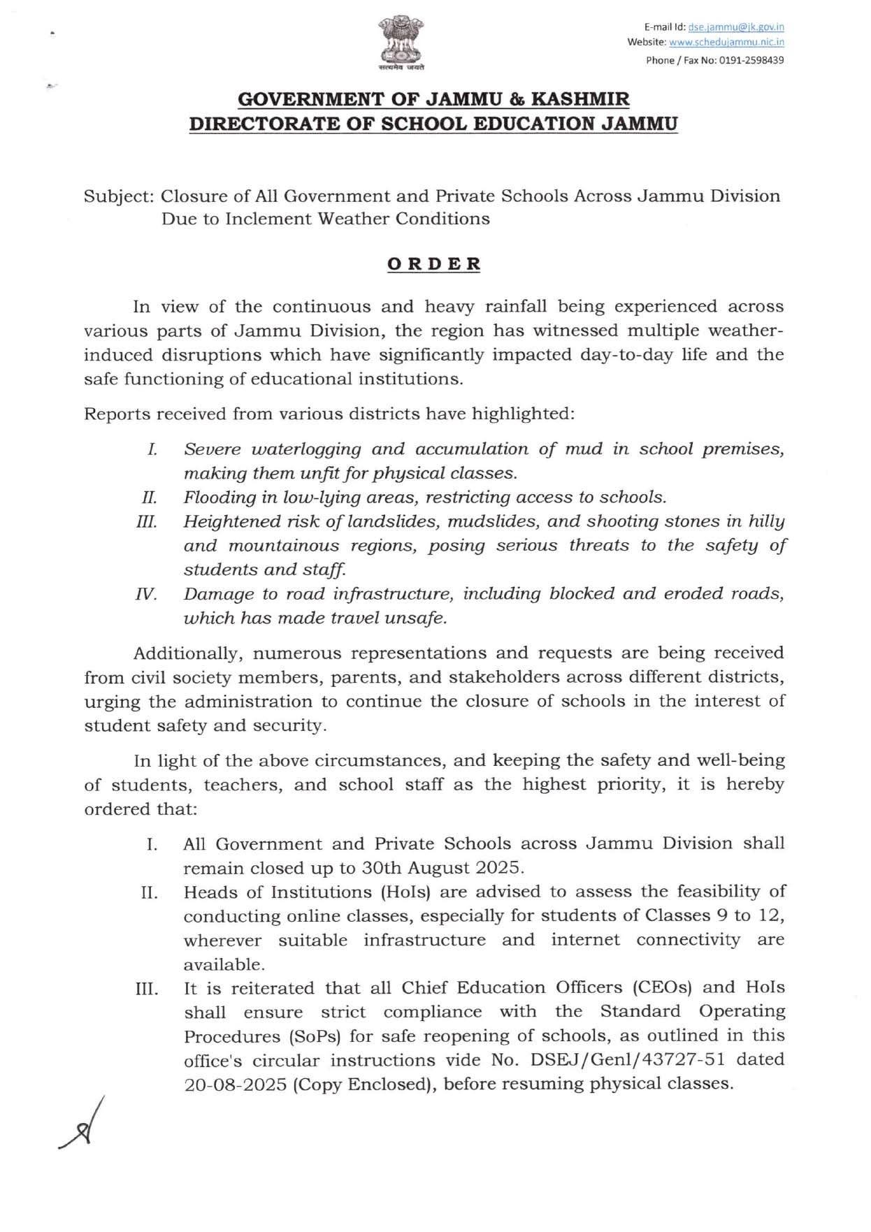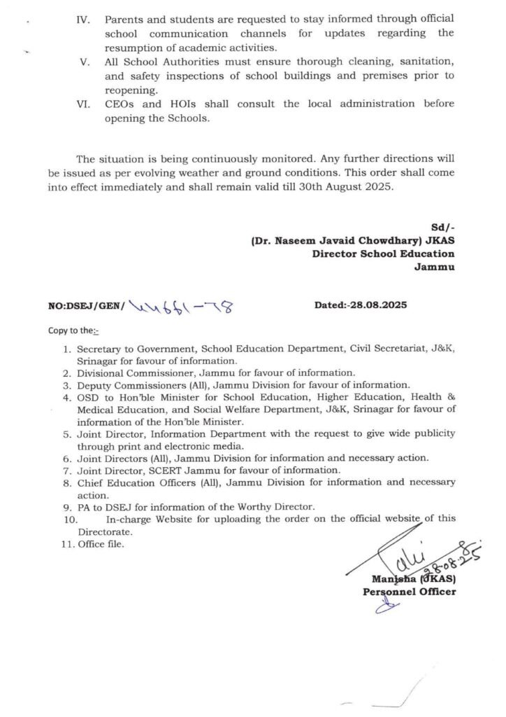 Jammu, Aug 28: The Directorate of School Education Jammu (DSEJ) on Thursday ordered closure of all government and private schools across Jammu division till August 30, 2025, due to continuous heavy rains and safety concerns.