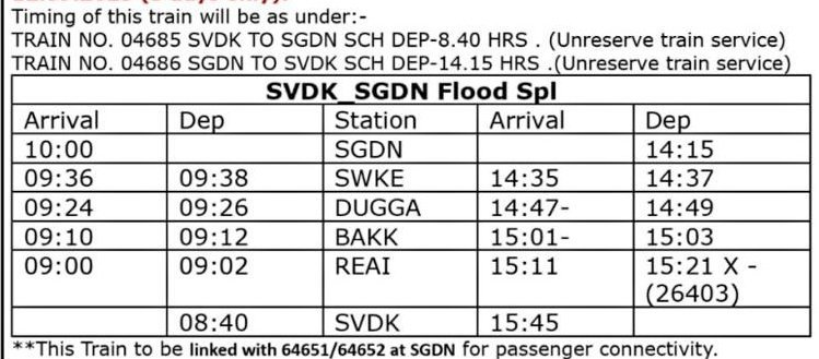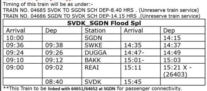 In wake of the affected road connectivity on Jammu Srinagar NH-44, due to floods and landslides, Jammu Rly Division shall run a local train from Shri Mata Vaishno Devi, Katra (SVDK) to Sangaldan (SGDN) station for the next five days from September 08 to 12, 2025.