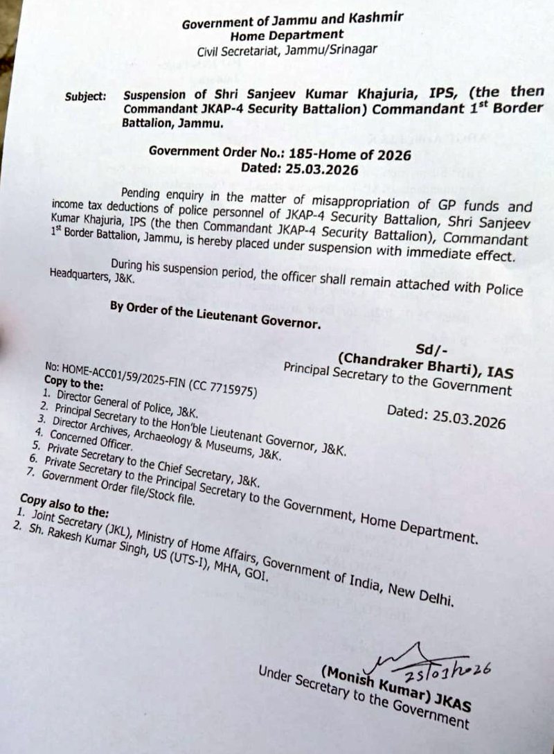 JAMMU: The Jammu and Kashmir Government has placed IPS officer Sanjeev Kumar Khajuria under suspension with immediate effect pending an inquiry into the alleged misappropriation of GP funds and income tax deductions of police personnel of JKAP-4 Security Battalion.