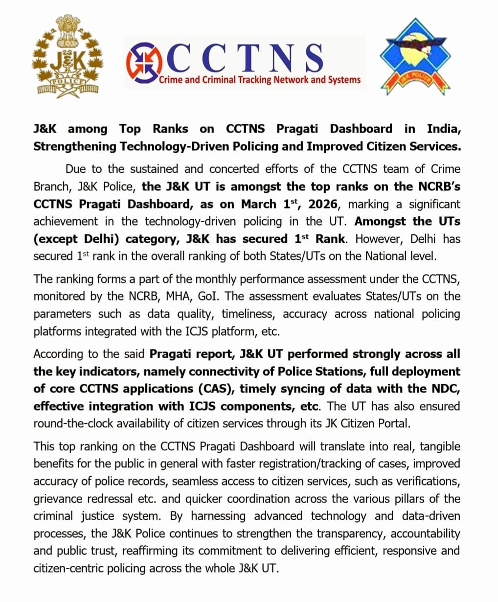 Due to the sustained and concerted efforts of the CCTNS team of Crime Branch, J&K Police, the J&K UT is amongst the top ranks on the NCRB’s CCTNS Pragati Dashboard, as on March 1st, 2026, marking a significant achievement in the technology-driven policing in the UT. Amongst the UTs (except Delhi) category, J&K has secured 1st Rank. However, Delhi has secured 1st rank in the overall ranking of both States/UTs on the National level.