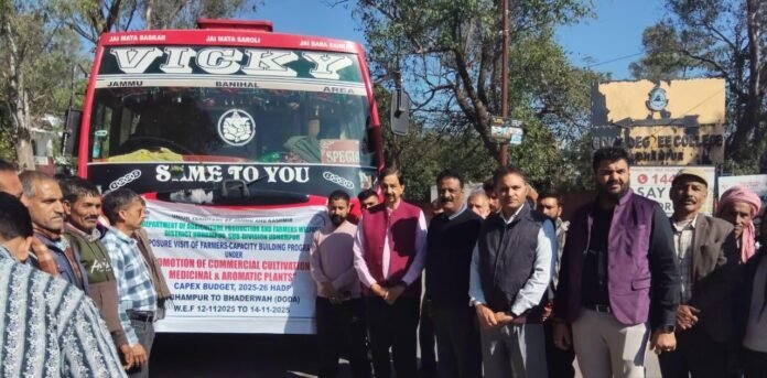 UDHAMPUR, NOVEMBER 12: Member Legislative Assembly Udhampur West, Pawan Gupta today flagged off a group of 40 farmers here from Panchari on a 3 Day exposure visit to KVK Bhaderwah under the HADP Project “Promotion of Commercial Cultivation of Medicinal and Aromatic Plants.”