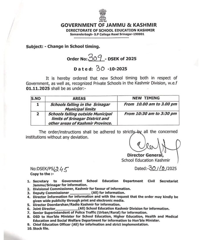 As per the order issued by Director General School Education Kashmir, G. N. Itoo, schools located within the Srinagar municipal limits will operate from 10:00 am to 3:00 pm.