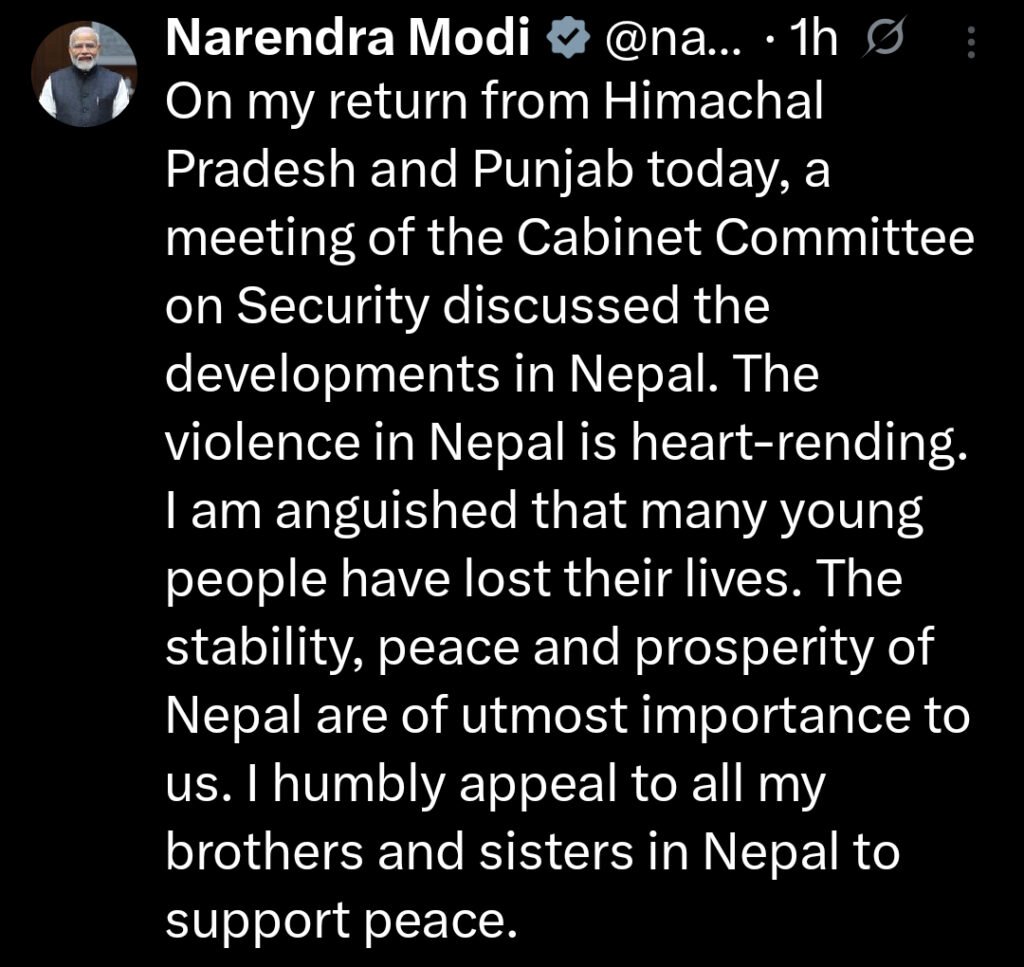 On his return from an official visit to Himachal Pradesh and Punjab, Prime Minister Shri Narendra Modi today chaired a meeting of the Cabinet Committee on Security to discuss the developments in Nepal. The Prime Minister expressed deep anguish over the violence, which has claimed the lives of many young individuals. In a heartfelt appeal, he urged all citizens of Nepal to uphold the values of peace and unity.In separate posts on X, Shri Modi stated:“On my return from Himachal Pradesh and Punjab today, a meeting of the Cabinet Committee on Security discussed the developments in Nepal. The violence in Nepal is heart-rending. I am anguished that many young people have lost their lives. The stability, peace and prosperity of Nepal are of utmost importance to us. I humbly appeal to all my brothers and sisters in Nepal to support peace.”“आज हिमाचल प्रदेश और पंजाब के दौरे से लौटने के बाद Cabinet Committee on Security की बैठक में नेपाल के घटनाक्रम को लेकर विस्तार से चर्चा हुई। नेपाल में हुई हिंसा हृदयविदारक है। यह जानकर बहुत पीड़ा हुई कि इसमें अनेक युवाओं की जान गई है। नेपाल की स्थिरता, शांति और समृद्धि हमारे लिए अत्यंत महत्वपूर्ण है। मैं नेपाल के अपने सभी भाई-बहनों से विनम्र अपील करता हूं कि वे शांति-व्यवस्था बनाए रखें।”“आज दिनभरीको भ्रमणबाट फर्किएपछि सुरक्षा सम्बन्धी मन्त्रिपरिषद् समितिको बैठकमा नेपालको घटनाक्रमहरुको बारेमा विस्तृत छलफल भयो । नेपालमा भएको हिंसा हृदयविदारक छ । धेरै युवाहरुले आफ्नो ज्यान गुमाउनु परेकोमा मेरो मन अत्यन्तै विचलित छ । नेपालको स्थिरता, शान्ति र समृद्धि अत्यन्त महत्वपूर्ण छ । म नेपालका सबै मेरा दाजुभाइ तथा दिदीबहिनीहरुलाई शान्ति–व्यवस्था कायम राख्न विनम्रतापूर्वक अपील गर्दछु ।”