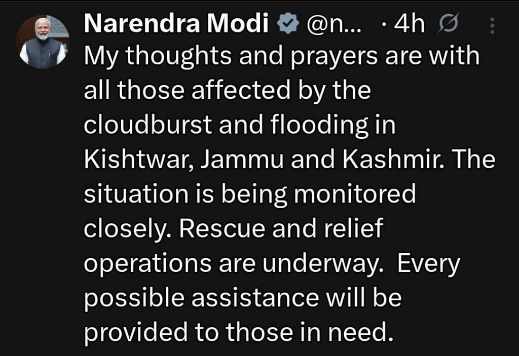 “My thoughts and prayers are with all those affected by the cloudburst and flooding in Kishtwar, Jammu and Kashmir. The situation is being monitored closely. Rescue and relief operations are underway. Every possible assistance will be provided to those in need.”