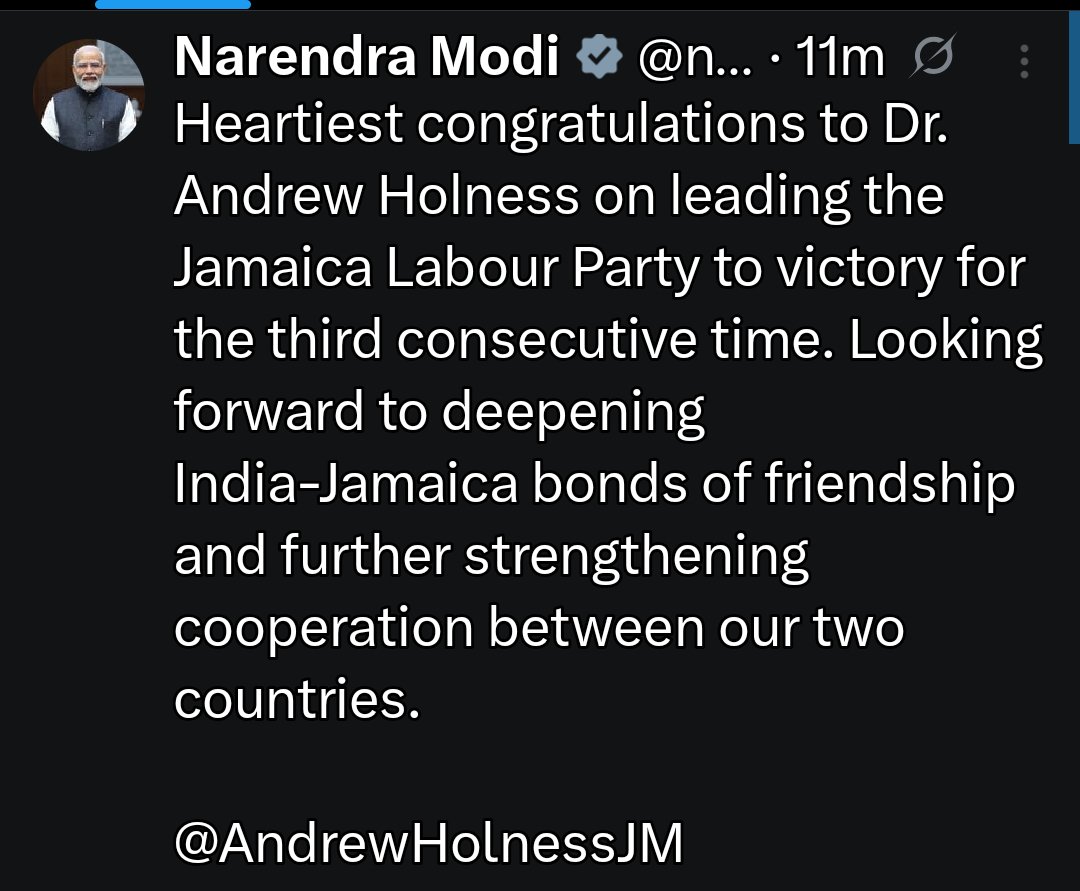 “Heartiest congratulations to Dr. Andrew Holness on leading the Jamaica Party to victory for the third consecutive time. Looking forward to deepening India-Jamaica bonds of friendship and further strengthening cooperation between our two countries.”