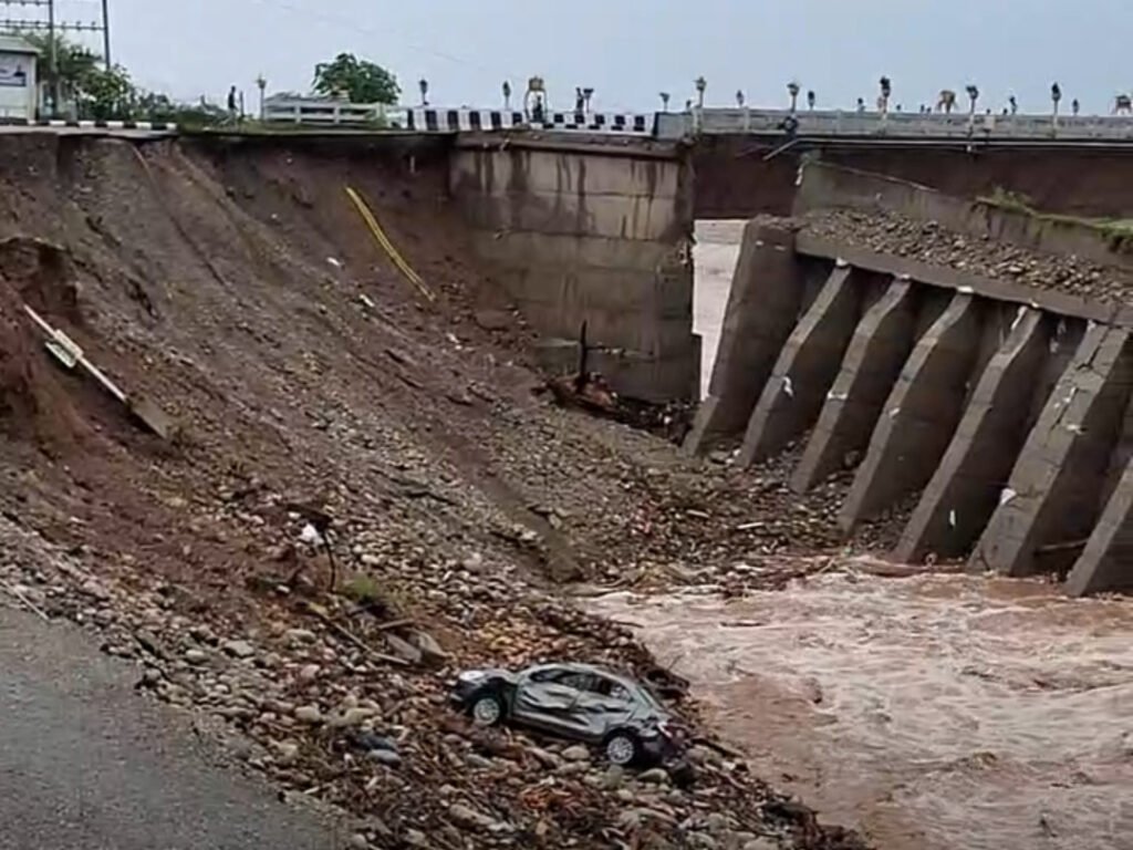 Road near the fourth Tawi Bridge Jammu has been partially washed away as water bodies swell following incessant heavy rainfall in J&K