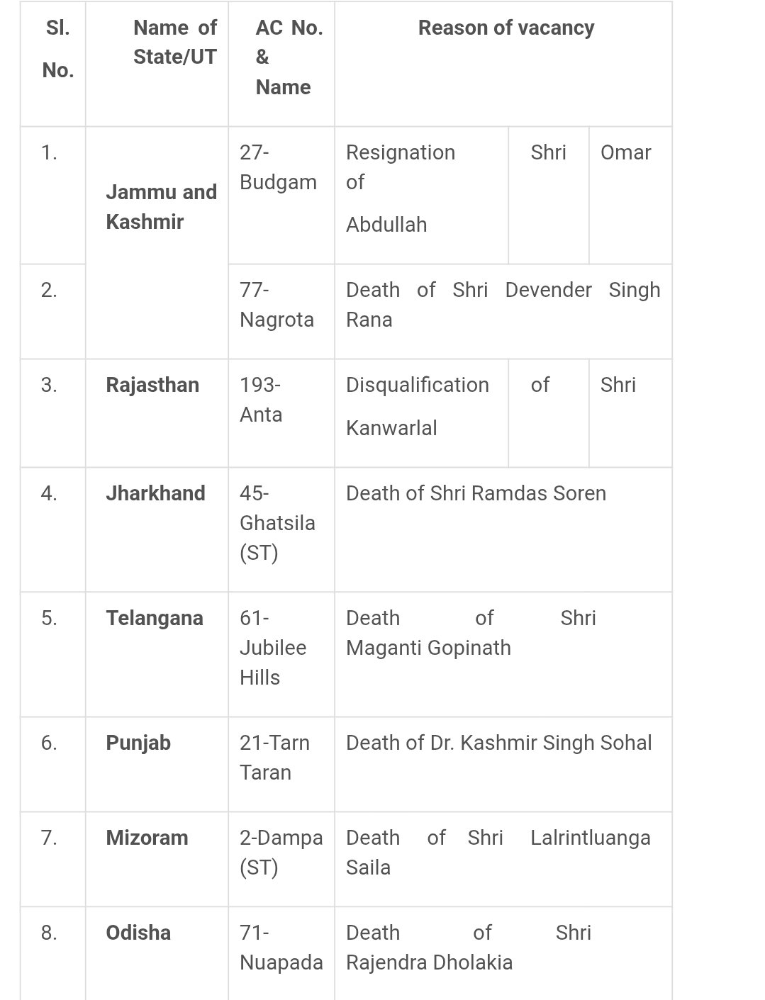 Schedule for Bye-election to 8 (Eight) Assembly Constituencies of Jammu and Kashmir, Rajasthan, Jharkhand, Telangana, Punjab, Mizoram and Odisha