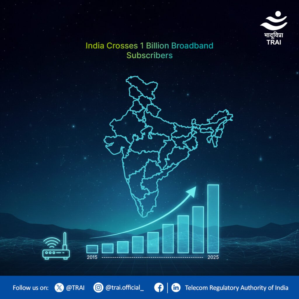 In the month of November 2025, the Broadband subscriber base in India crossed the 1 billion (100 crore) mark.