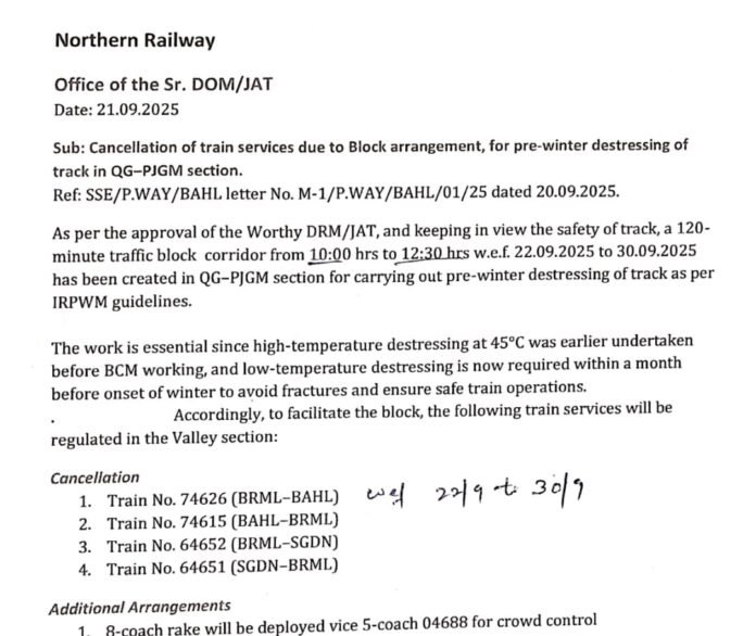 Srinagar, September 21: Rail authorities have announced the cancellation of four train services on the Banihal-Srinagar route for a period of nine days, from September 22 to September 30, 2025, to facilitate essential track maintenance work.