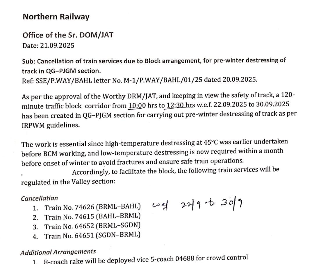 According to officials, two trains each from Banihal and Srinagar will remain suspended during this period. From Banihal, the trains scheduled to depart at 10:45 a.m. and 3:05 p.m. will not operate. From Srinagar, the services departing at 8:15 a.m. and 10:30 a.m. will also remain cancelled.