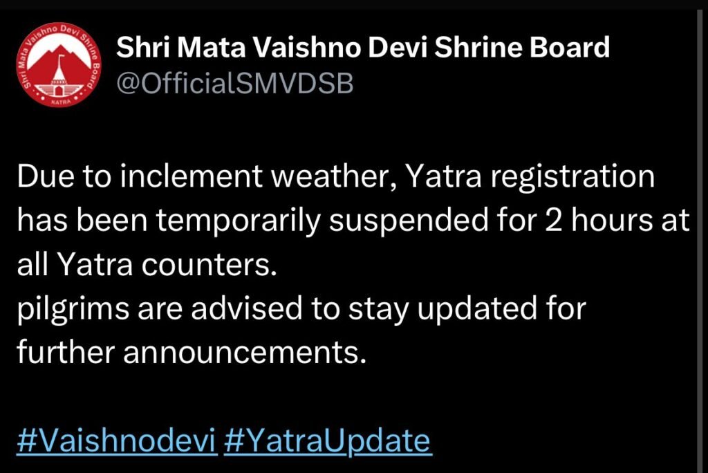 Vaishno Devi Yatra: Registration suspended for 2 hrs at all counters due to bad weather. Pilgrims advised to stay updated for further announcements.